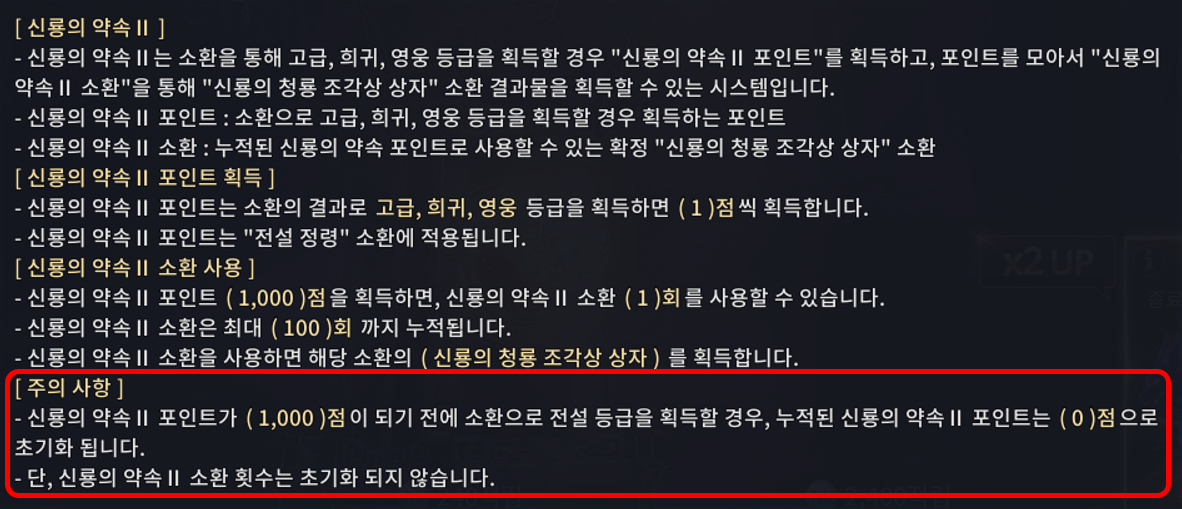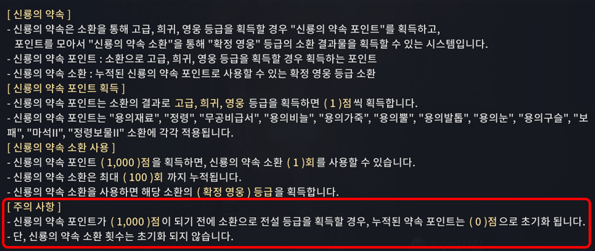 기본 규칙 - 상점 내 [소환]탭에서 소환 진행 시 고급/희귀/영웅 등급 갯수당 1포인트씩 적립됩니다. ① 각 소환 종류별로 신룡의 약속 포인트는 개별적으로 적립됩니다. 암시장을 통한 소환은 신룡의 약속 포인트로 적립되지 않습니다. ② '영웅'등급 확정 소환을 위한 필요 포인트는 1,000포인트이며, 충족 시 소환 횟수 1이 추가됩니다. 이 소환 횟수는 최대 100까지 누적할 수 있습니다. 추가된 소환 횟수 1을 누르면 아래와 같은 알림이 발생하며 영웅 등급 아이템 혹은 신룡의 청룡 조각상 상자를 소환할 수 있습니다. 추가로, 최대 소환 횟수 100에 도달한 상태로 일반 소환을 진행할 경우 신룡의 약속 포인트를 획득할 수 없습니다.