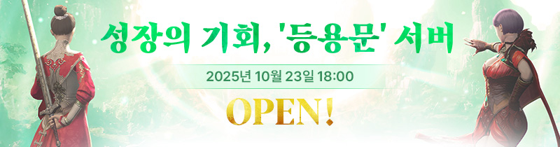 등용문 서버 정보 - 등용문 서버에서는 일정 기간 동안 특별한 성장 버프와 함께 다양한 성장 혜택이 적용됩니다. - 성장 혜택이 종료된 후 해당 서버는 일반 서버로 전환되고 기존에 제한되었던 콘텐츠들을 이용할 수 있게 됩니다. ✔ 등용문 서버 성장 혜택 기간 - 2025년 10월 23일(목) 오후 6시부터 ~ 2026년 2월 26일(목) 업데이트 전까지(약 18주간) ✔ 등용문 서버 입장 방법 ① 미르4 로그인 후 [서버 변경] 버튼을 클릭하면 전체 서버 리스트가 출력됩니다. ② 전체 서버 리스트에서 등용문 서버를 클릭한 후 화면을 터치해 주시면 등용문 캐릭터 생성 및 선택 화면으로 이동할 수 있습니다. - 성장 혜택 기간 동안 기존 서버의 캐릭터로는 등용문 서버를 이용하실 수 없으며, 등용문 서버에서 새롭게 생성된 캐릭터를 통해서만 등용문 서버를 이용하실 수 있습니다. - 등용문 서버에서는 계정당 1개의 캐릭터 슬롯이 제공됩니다. ③ 이용하실 캐릭터를 선택한 후 [게임시작] 버튼을 통해 등용문 서버를 시작하실 수 있습니다.
