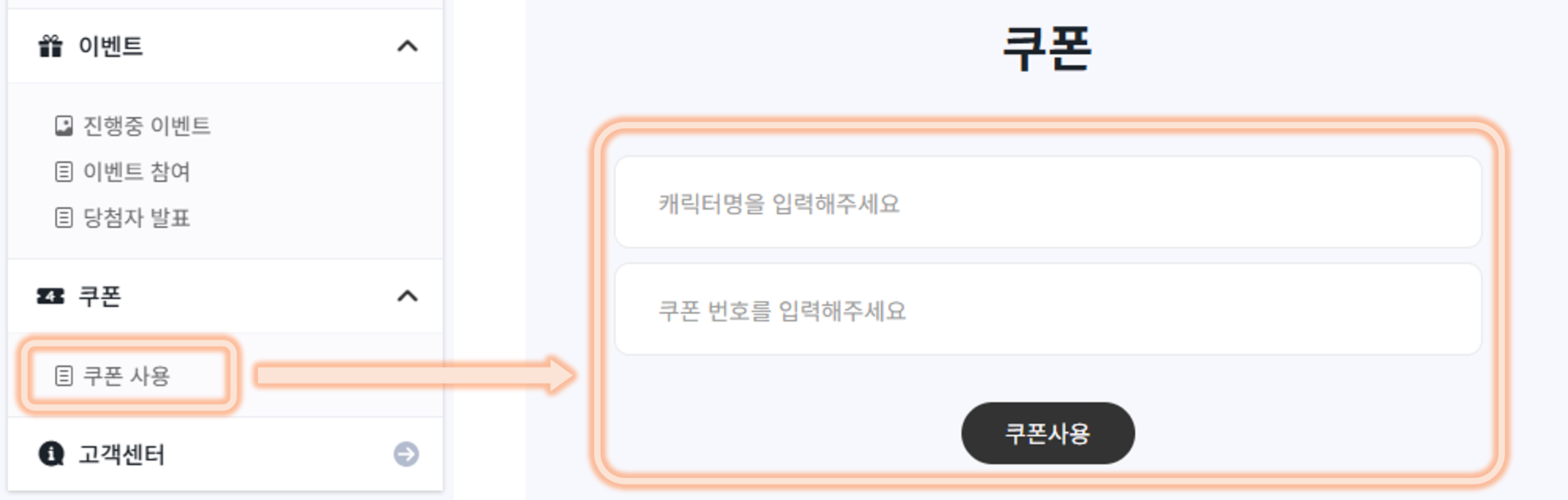 - 미르4 공식 커뮤니티 페이지 좌측 하단의 '쿠폰 사용'을 클릭한 후 쿠폰을 수령할 캐릭터명과 쿠폰 번호 입력 ② 미르4 게임 내 쿠폰 번호 입력 방법