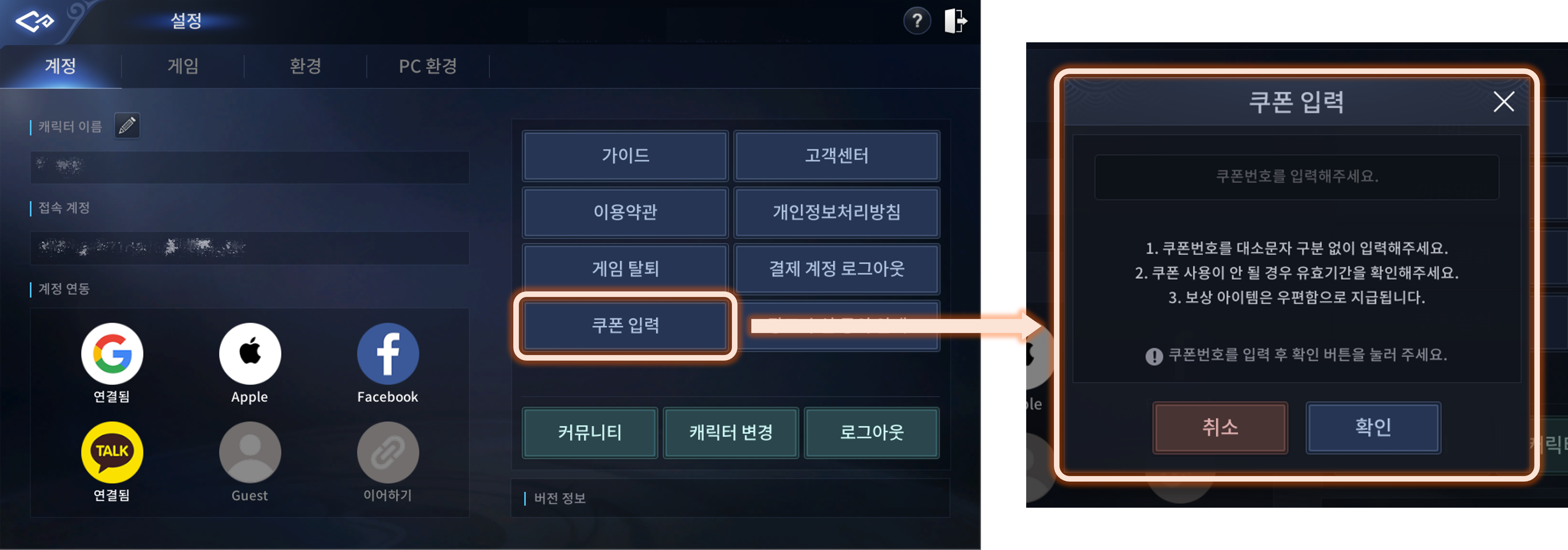 - 쿠폰을 수령할 캐릭터로 접속한 후 [게임 내 메뉴(+) > 시스템 > 쿠폰 입력] 부분에서 쿠폰 번호 입력