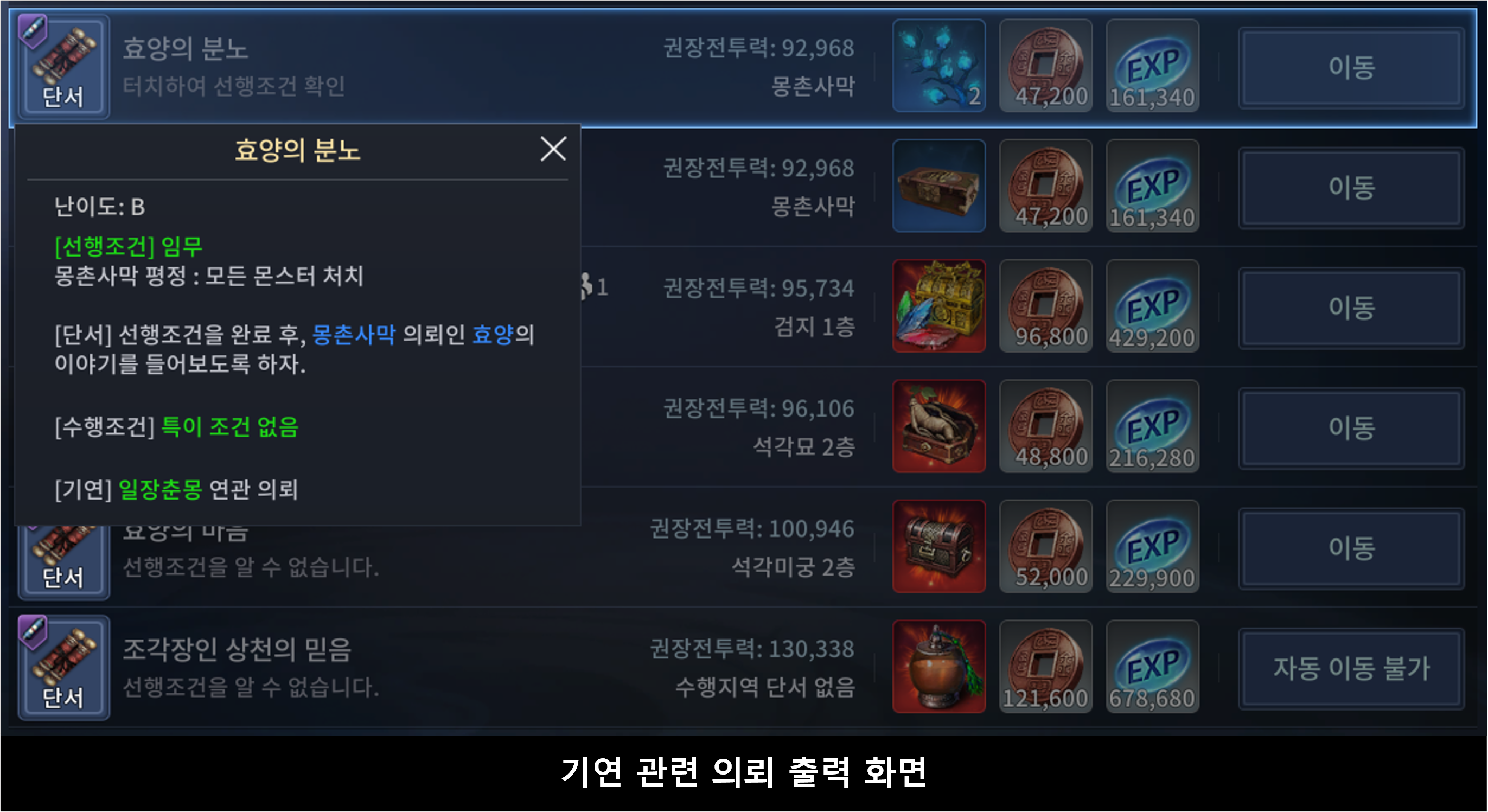 - 2) 각 의뢰의 [단서]를 클릭할 시 출력되는 툴팁에서 연관된 기연에 대한 정보를 더욱 상세히 확인할 수 있습니다.