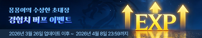 | 3월 26일(목) ~ 4월 8일(수) 매일 20:00 ~ 24:00 | 사냥 경험치 증가 +100% | 백룡 01 ~ 04 |
