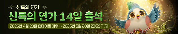 - 4월 23일(목)부터 총 4주간 '신록의 연가 14일 출석 이벤트'가 진행됩니다.